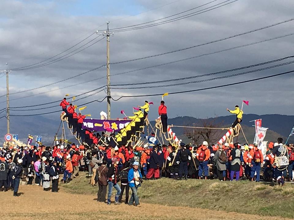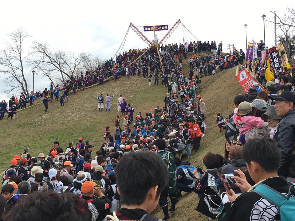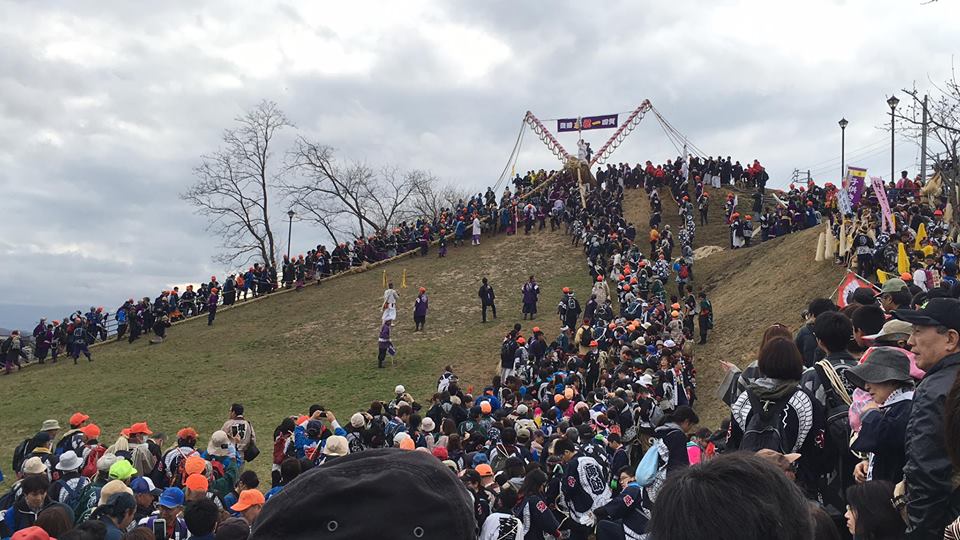 Early in the morning on April 3rd, Ujiko of Shiga/Toyoda area gathered at the kiohotoshi-zaka hill. Every one of them had been looking forward to this Kiotoshi log-sliding for a long time. I was so excited about the chance that I could see the event so close and be part of the event with my family (My dad, wife, 7 years old son, my big brother and his family who visited us for the festival from Tokyo).