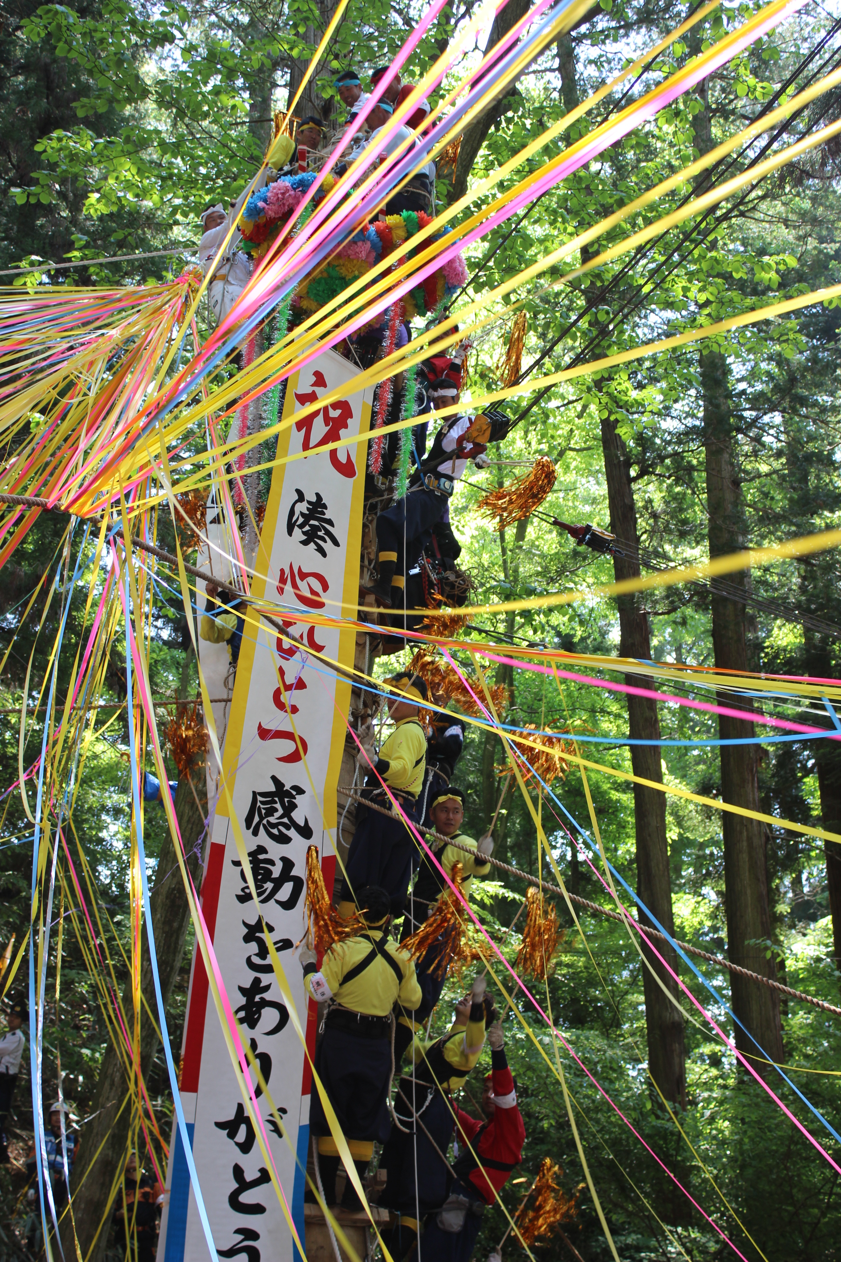 Once there, one by one they raise the hashira at the four corners of the shrine grounds in an exuberant celebration known as Tateonbashira. This is the climax and final part of Onbashira proper.